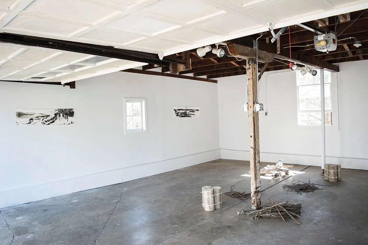 Erik L. Peterson: Ink & Water was a collection of ink on paper painting made with water collected in Peoria. Guests were invited to help the artist make a fire with wood found on-site, the ashes used to make ink.